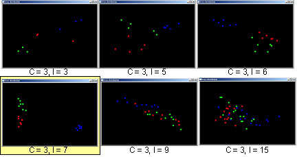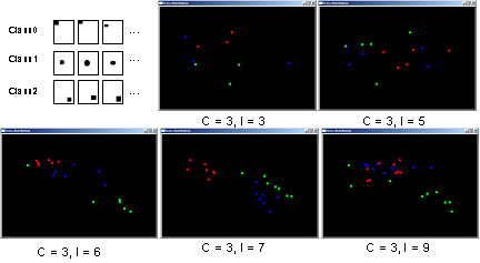However, we found out that if number of class is fixed, the clustering result is better when number of data in each class is assigned between 5 to 7. Because we are not sure whether it could be generalized or not, we tested with some images that possesses very simple features. It is shown in Fig5. These results show us again that in certain size of class has more desirable clustering result between each class. But, we cannot say it is general phenomena. We just presume that it is due to low dimensional subspace. Because LDA/GSVD reduced the dimension from 3000 to k -1 dimension where k is number of class, this k – 1 subspace is too small in larger data set in each class. Thus we assume that 5 to 7 is appropriate number of data to fit in the space. |