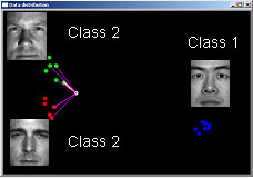 (3) On-line test results As shown in the Fig6. each Blue, Green, Red point represent each class or person. Blue is class 0, Green is class 1 and Red is class2. When one test image is coming, this 3000 dimensional data hit the G matrix and is mapped into this 2 dimensional reduced space. This point is represented as white point. Then, Calculate the nearst neighborhood. |