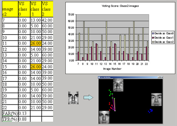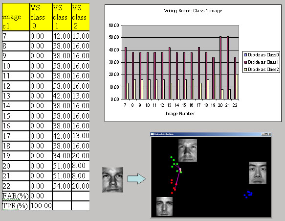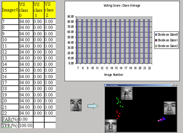 Data in the Fig7 shows the first result, Test image is 16 image of class 0 or first person. In the off-line training step, 0 to 6 images are already used. These 16 images also include different pose and expression. As shown in the training result, first person (blue point)’s data is well separated from two other people. The result is pretty nice. He got highest score from every testing. So Success rate is 100% and FAR is 0 % at this moment. |