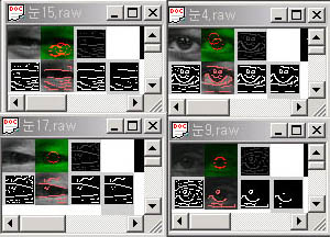 1. Face Detection : (97~98% success rate in FERET face set, with very low FAR(False Accept Ratio)) •Image Enhancement: Noise reduction of Input image with various Histogram equalization. Better labeling of eye-area in binary image via various filter including Morphological operator. •Face Candidate Extraction: Worked to come up with a multiple operator filter optimized through numerous comparison tests between morphological operator which is weak in eye with glasses but robust in illumination, and 2nd Gaussian filter that is relatively strong in illumination but weak in glasses. On the other hand, I decided not to use Neural network and Knowledge based extraction after experiments and tests. That was because when compared to the former, the later took more time for calculation, leading to a failure of optimization for better output. •Face Verification (Face Candidate Qualification): Face/Non-Face classification was applied. For this, Principal Component Analysis (PCA: linear classification), a classical method used mainly for recognition, Support Vector Machine (SVM: non-linear classification) and Mahalanobis Distance (MHD: calculating confidence with reference image) were employed. After various tests, we were able to get successful verification result by applying a combination of each classification, or weighting. •Iris Localization: It was optimized after a lot of trial and error based on iris segmentation using edge-based Hough transform and 2ndGaussian filter. |