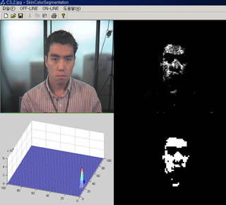 What I've done : Color Segmentation Skin Color Segmentation : •Need for fast eliminating non-face region made me research the skin color segmentation. : The essential is to make an optimized LUT(Look Up Table) to decide whether incoming pixel is skin color or not. To make LUT, numerous skin & non-skin patch images and color informations are trained. Then, 2 layered(skin/non-skin) array(LUT)accumulated in HS dimension. After that, Distributions of 2 layer modified by 2 ways -EM(Expectation Maximization) alg. or SOM(Self Organizing Mixture model)-. When a pixel incomes, the pixel compared between skin/non-skin mixture models, then it finally is confirmed whether skin pixel or not. However, skin segmentation skill is somewhat out-of-date. Because of it's weakness at various lighting env' and dependency to each camera types. Unfortunately, my skin model could not be able to feed into out project. But I'm sure if there could be more robust models that color segmentation could be very useful in some area |