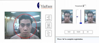 UI of Viaface At first, user need to register his or her normal face data to DB. After that, whenever the user stand front of the camera of Viaface, the system matches the user's facial features,extracted from the camera image, to registered data. |