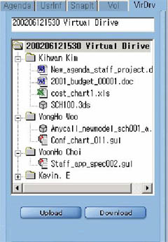 What I've done : App' Sharing : The application sharing in syncbiz has three method. (1) Image based sharing :When master select an application that he or she want to share, initial image of the application send to other users within same session. If someone who have a control modify or edit in the application, the optimized-changed area cropped then send to others. (2) Command based sharing : With hooking the windows command messages, Synbiz sends it to server, then server broadcasts to other users syncbiz. but in this case, every user must have same shared window application. (3) Mixed version : Based on image sharing method, some tasks within window common procedure are fulfilled by command based sharing. It is useful to narrow band environment. Syncbiz uses (1) and (2) selectively in certain environment. What I've done : Overall UI : Syncbiz has many modules and each module has varioius functions and commands, so the initial aim of UI of Syncbiz was 'more convinient and easier to use' while the quality of UI had to keep XP-level GUI for every platform( including windows98,2000,linux ), so I designed all of the UI from tiny control to overall dialogues. What I've done : Agenda Mgr : Agenda manager is also called "Forum tree". It's role is managing overall agenda and documents used in certain conference in Syncbiz. Data on this module is formed by tree structure with DB server. So users in same session(conference)are sharing same tree data structure in real time by Agenda Mgr's synchronizing process. After the session is over, Agenda Mgr will arrange this data and make the report. What I've done : Syncbiz Middleware : Syncbiz middleware basically follow common TCP-IP. However, Client server contain's Smart switching process and a Centural server also has load balancing for each syncbiz server so, this middleware is useful from low-band to high-band. As an example, when it applied to Denso( Japanese company), it is modified by selector to available in ISDN 2B. |